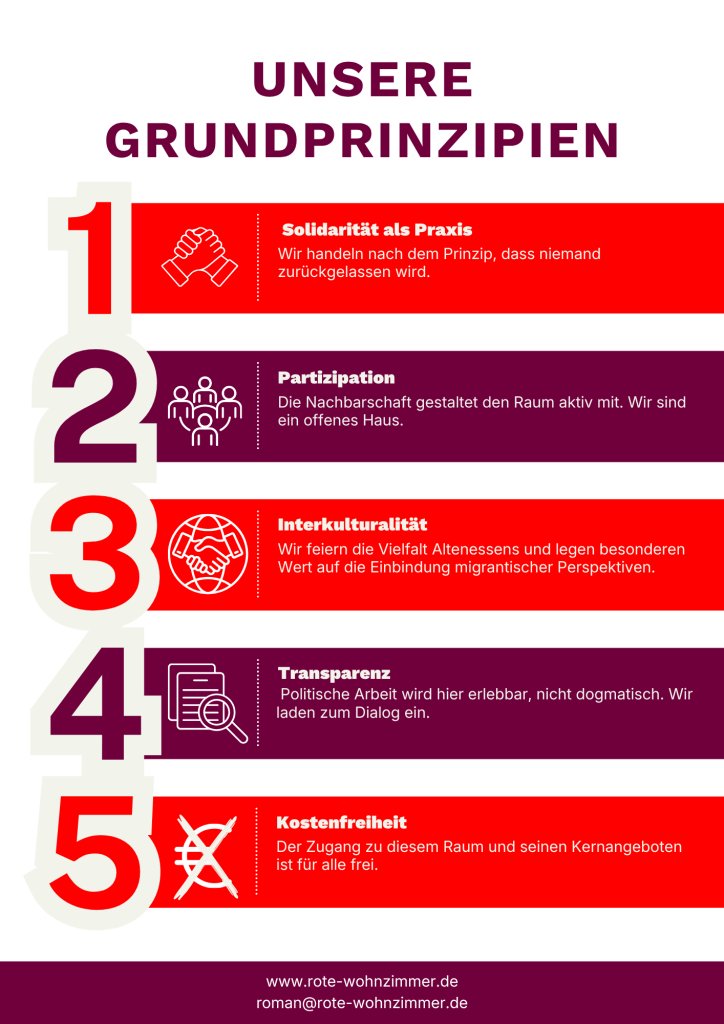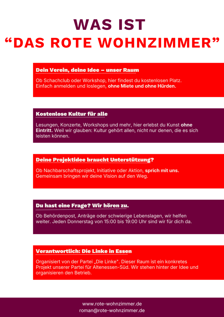 Das Rote Wohnzimmer ist ein Ort, der die Vielfalt unseres Stadtteils widerspiegelt. Wir schaffen einen Treffpunkt, der Menschen unabhängig von Herkunft, Alter oder Einkommen zusammenbringt. Unser Ziel ist ein sozio-kulturelles Miteinander, das alle Bewohner:innen von Altenessen-Süd einbezieht und besonders diejenigen stärkt, die oft weniger Gehör finden.